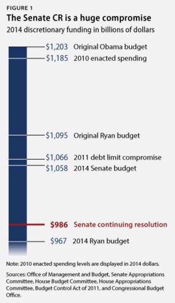 Over the last several weeks, however, with a shutdown deadline looming, it was time for the parties to lay out their demands. Republicans demanded fewer health care benefits for Americans. Democrats could have demanded anything -- an end to the damaging sequestration policy, elimination of the debt ceiling, a vote on immigration reform, universal background checks -- but instead started in the center. Congressional Dems were even willing to accept painfully low spending levels, as evidenced by this chart Michael Linden and Harry Stein published yesterday, just to ensure the government didn't shut down.