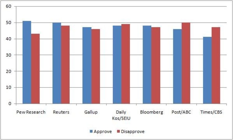 As of this morning, I've seen seven national polls released this week: Pew Research Center, Reuters, Gallup, Daily Kos/SEIU, Bloomberg, Washington Post/ABC News, and the aforementioned New York Times/CBS News survey. I put together a chart showing Obama's approval/disapproval in each of the seven: