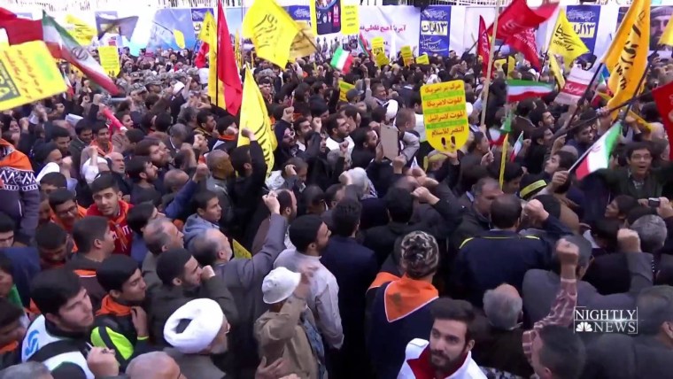 The crowd chanted "Down with U.S." and "Death to Israel" during the rally in the capital, and state TV said similar demonstrations were held in other cities and towns.