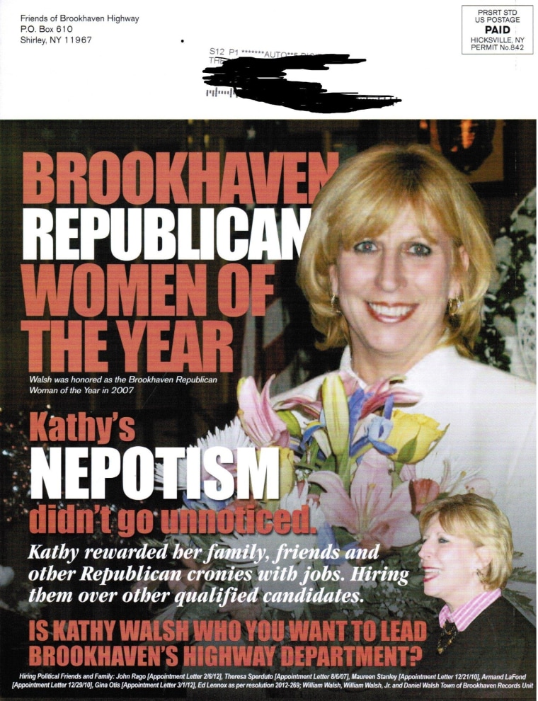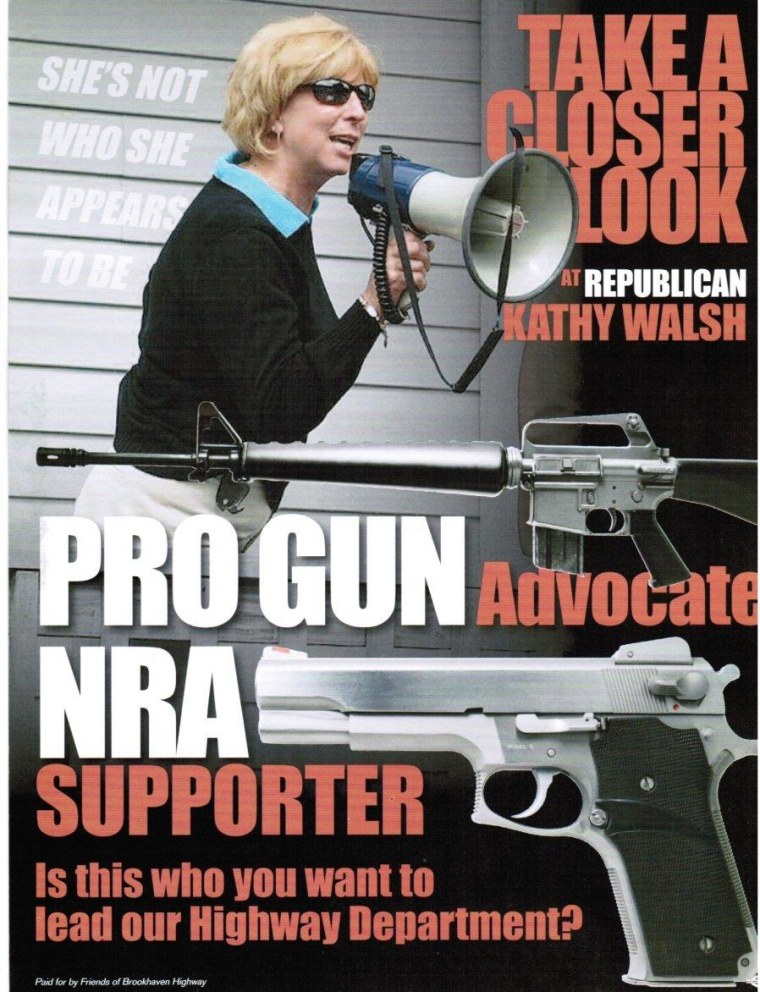 Kathleen Walsh is a former Republican now running (pdf) on the Independence Party and Democratic Party lines. As with Losquadro, local Newsday describes Walsh as a supporter of Second Amendment rights. That seems to be part of the pitch against her in this flyer. Hershkowitz writes: "[I]t's a mystery why the full political machine is in effect for this relatively small special election. I'm certainly sick of the daily robocalls, flyers and commercials."