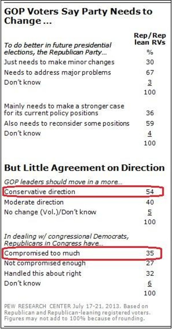The same poll found that a 54% majority of Republican voters want their party to be more conservative than it already is. A plurality of Republican voters believe their party has compromised too much with Democrats.