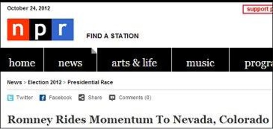 I saw a curious headline from NPR this morning: "Romney Rides Momentum To Nevada, Colorado." Reuters had a similar headline this morning, touting Romney's "momentum," and Slate did the same thing yesterday.