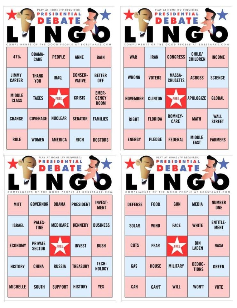 Folks, we're on live tonight at 8 Eastern for coverage of the first presidential debate. The debate starts at 9 Eastern, but you'll want to be ready before that. And to help with that, Bob Staake, a genius of children's books and New Yorker covers, posted a Presidential Debate Lingo (bingo) set (click for full-size version).