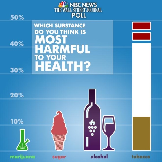 Americans think sugar is more harmful to a person's health than marijuana, according to an NBC News/Wall Street Journal poll released this week. The answer choices to the poll question were tobacco (49%), followed by alcohol (24%), sugar (15%), marijuana (8%), all (3%), and not sure (1%).