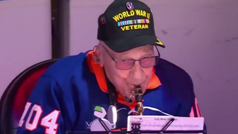 Dominick Critelli, a 104-year-old World War II veteran and Battle of the Bulge survivor, stunned the crowd at UBS Arena with a saxophone rendition of the national anthem. Watch the emotional moment that had fans chanting "USA!" in unison. NBC News’ Hallie Jackson reports.Dec. 31, 2025