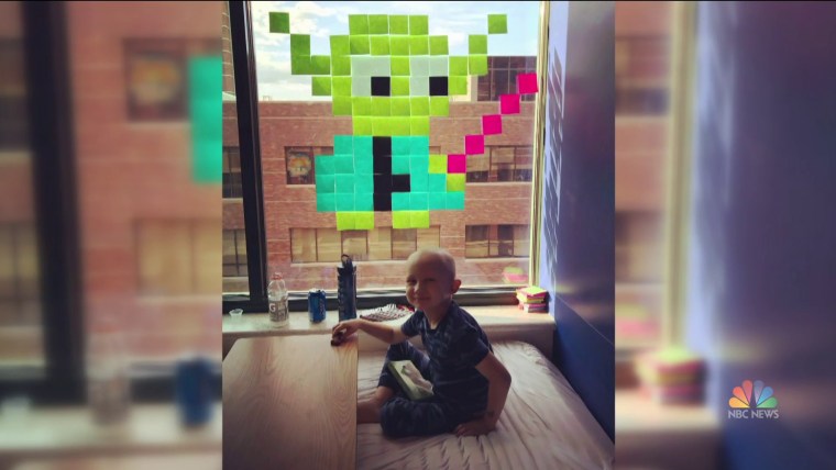 While undergoing brain cancer treatment, 5-year-old Meyer Mixdorf put up sticky note art on the window of his Kansas City hospital room. Across the street, someone started putting sticky note art up in their window in response in an exchange that went back and forth for weeks before the two finally met in person.Aug. 14, 2021