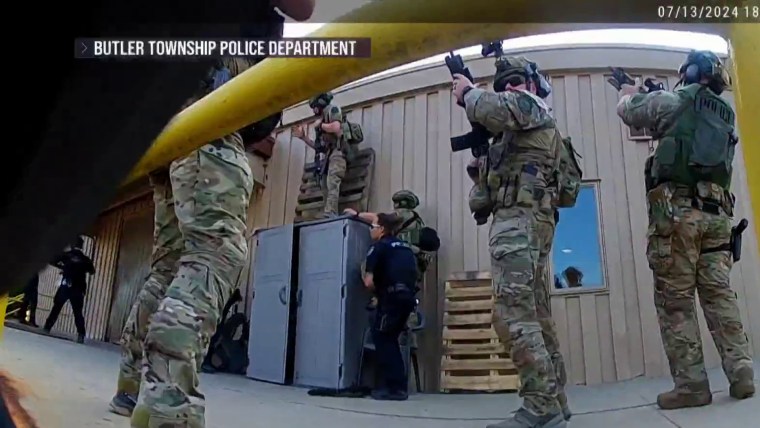 Newly released police body cam video shows the chaotic moments just before the attempted assassination of former President Donald Trump in Pennsylvania last month, with local police blaming the Secret Service for the security lapse. NBC News' Gabe Gutierrez reports.Aug. 8, 2024