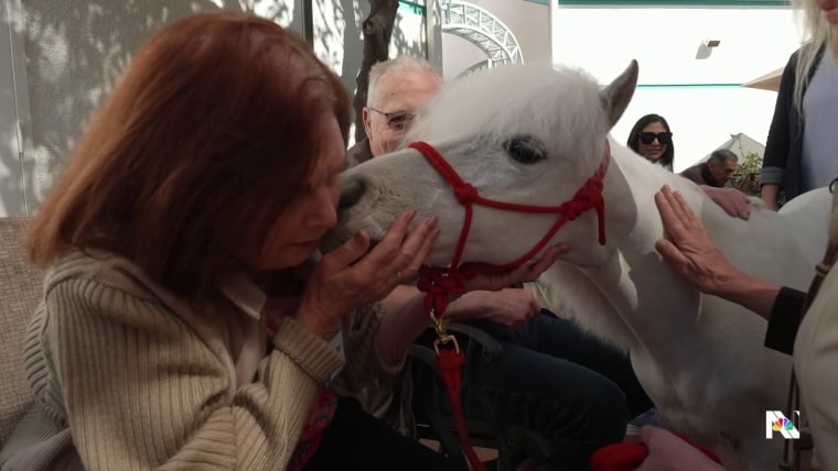 The seniors at an adult daycare in California have made fast-friends with two mini horses and handler, actress and filmmaker Daryl Hannah. The horse therapy is helping improve their quality of life. NBC News’ Steve Patterson has the story.March 25, 2025