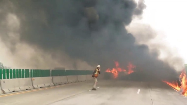 Investigators say one semi plowed through a construction median, causing vehicles and another truck traveling in the opposite direction to crash. One tractor trailer was left dangling off an overpass and several vehicles were caught in the flames.June 19, 2019