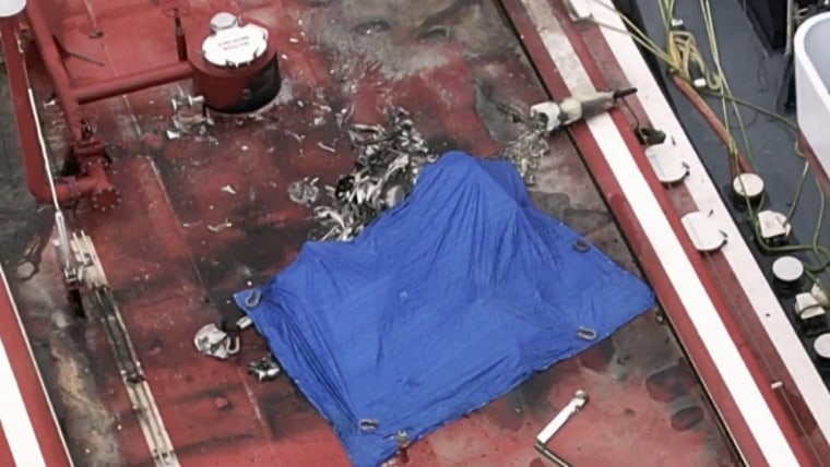 The chopper crew is believed to have been working on power lines when it crashed into one of them and then hit the barge below. Large plumes of smoke and an explosion were captured on camera in the incident that killed two. NBC News’ Adrienne Broaddus reports.Aug. 7, 2025