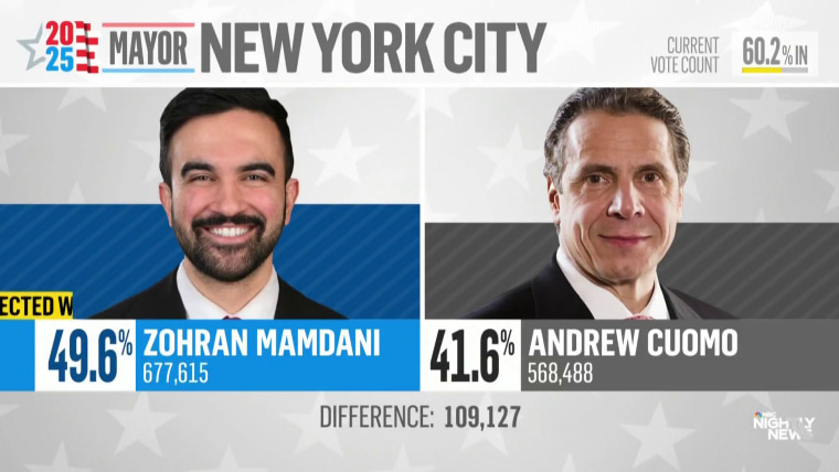 The New York City mayor’s race tops the marquee races in several blue states tonight. In New Jersey, the governor’s race is expected to go down to the wire. NBC News’ Sam Brock reports.Nov. 5, 2025