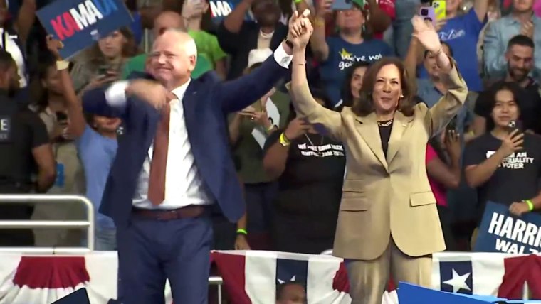 The Harris campaign is touting its crowd sizes at rallies as a new poll shows a change in the race’s momentum in Wisconsin, Michigan, and Pennsylvania. But the campaign is also facing questions connected to Governor Tim Walz’s service in the National Guard. NBC News’ Aaron Gilchrist reports.Aug. 10, 2024
