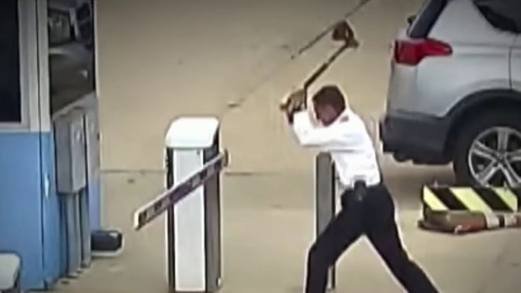 A pilot is accused of attacking a parking lot gate at the Denver International Airport with an ax after multiple cars were backed up behind the gate, police said. United Airlines is investigating the incident, which was caught on surveillance video. NBC News’ George Solis reports.Aug. 19, 2023