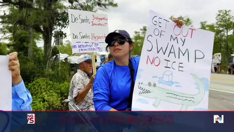 Protesters demonstrated against the migrant detention facility being constructed in the Florida Everglades, known as “Alligator Alcatraz.” It comes as the construction process appeared to speed up over the weekend. NBC News’ Ryan Chandler has the details.June 28, 2025
