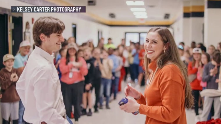 Julia Alexander teaches sixth grade. When her boyfriend, Andrew Pellegrino, decided he wanted to propose to Alexander, he tapped in some special guests to help out with the surprise: her students. They lined the hallways and celebrated with the happy couple after Pellegrino dropped to one knee. NBC Nightly News anchor Tom Llamas reports. Jan. 30, 2026