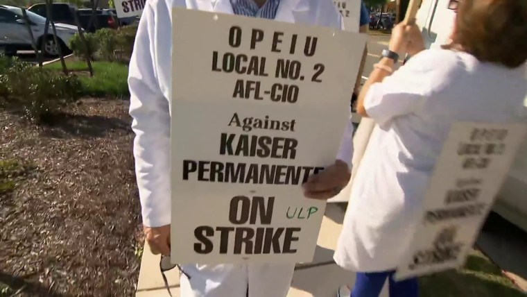 Kaiser Permanente workers, including pharmacists, optometrists, nurses and more, walked off the job nationwide, demanding more pay and more staff. NBC News’ Tom Costello has more details on the biggest health care strike in history.Oct. 4, 2023