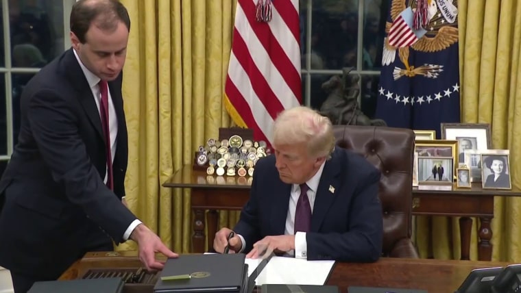 Beyond declaring a national emergency at the U.S.-Mexico border, President Trump said he would reinstate the "remain in Mexico" policy requiring asylum seekers to wait outside the U.S. and designating drug cartels foreign terrorist organizations. NBC News' Gabe Gutierrez reports.Jan. 21, 2025