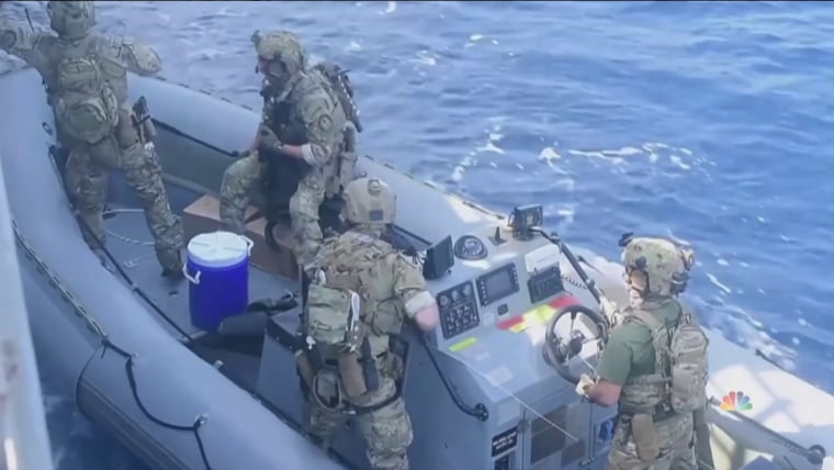 In a video released by the U.S. Navy, the USS Monterey is seen intercepting a ship. They seized nearly 3,000 assault rifles, hundreds of heavy machine guns, sniper rifles, rocket propelled grenade launchers, and dozens of Russian-made anti-tank guided missiles. U.S. officials are currently investigating where the weapons haul originated and where it was going.May 9, 2021