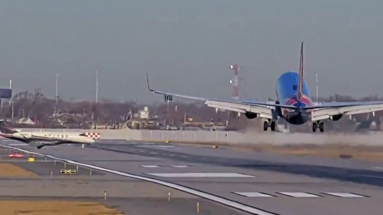 Video captures the moment a Southwest Airlines plane attempted to land, narrowly missing a private jet on the runway. The NTSB and FAA are investigating the incident, stating that the Southwest flight executed a go-around after an unauthorized business jet entered the runway.Feb. 25, 2025