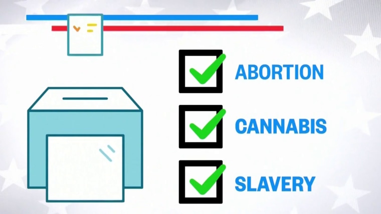 There are 132 statewide ballot measures this year in 37 states where voters are deciding on major issues that could change the way people live their lives in the U.S. NBC News’ Hallie Jackson has more on how topics like abortion, slavery and the legalization of marijuana are some of the top subjects on ballots. Nov. 7, 2022