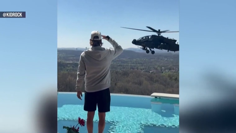 The Army has suspended the aircrew that was filmed flying military helicopters near Kid Rock's home in Tennessee. NBC News' Kelly O'Donnell reports on the incident, the social media video and the investigation being conducted.March 31, 2026