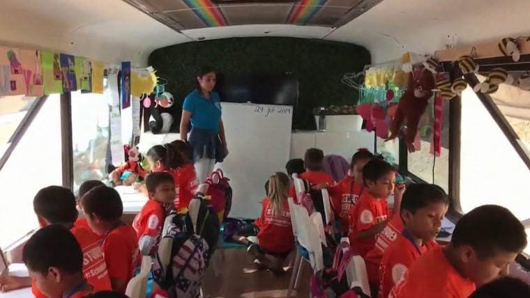 Estefania Rebellon paused her acting career to turn school buses into classrooms for kids at the border, and has enrolled about 2,500 children in the four years the program has been running. NBC's Sam Brock reports. May 19, 2023