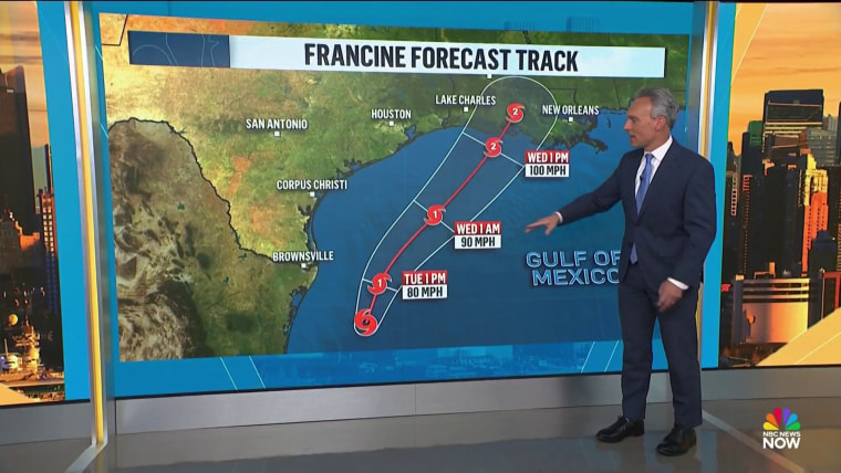 Tropical Storm Francine is expected to intensify into a Category 2 hurricane as it rapidly moves toward the northern Gulf Coast and Louisiana. NBC News’ Bill Karins gives the latest update on wind speeds and flooding potential.Sept. 10, 2024