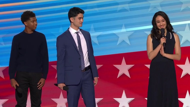Vice President Kamala Harris' nephews Alexander Hudlin, Jasper Emhoff, and niece Arden Emhoff took the stage to showcase how their aunt has been supportive throughout their lives during the DNC. Aug. 22, 2024