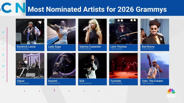 Kendrick Lamar, who dominated the 2025 Grammy Awards, again became a top nominee with nine nods. Lady Gaga received seven and Bad Bunny, Sabrina Carpenter and Leon Thomas received six, respectively.Nov. 7, 2025