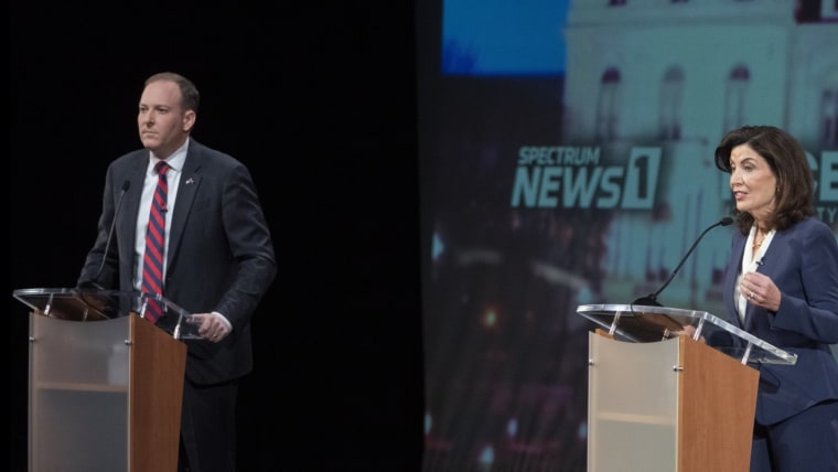Incumbent New York Governor Kathy Hochul faced off with Republican challenger Congressman Lee Zeldin on Tuesday in the state’s only televised debate as the gubernatorial race remains neck and neck. NBC News’ Ron Allen breaks down whether either of the candidates’ performance could move the needle on election day and which key issues are influencing voters across the state. Oct. 26, 2022