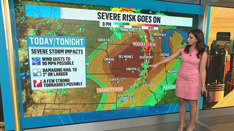 Severe weather, with a high chance of tornadoes, is expected in parts of eastern Iowa as intense storms move through the Midwest into the evening. NBC News’ Angie Lassman gives the forecast which includes hail and strong winds.May 21, 2024
