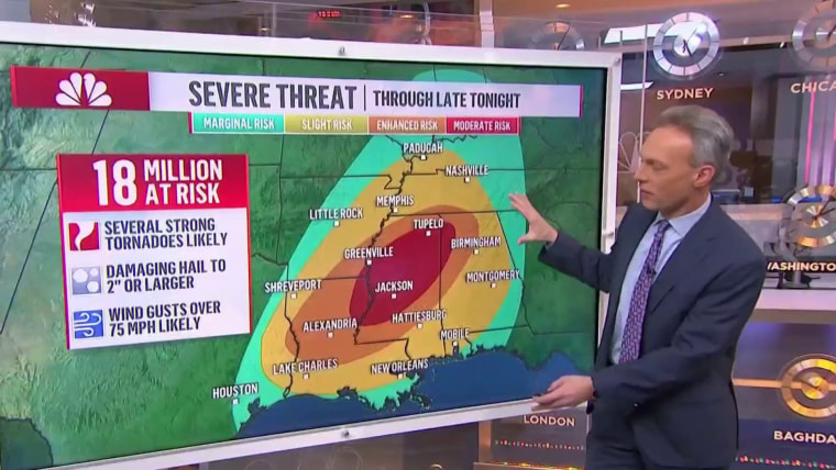 A winter storm system that stretches from New England to the Deep South is expected to bring severe weather including high winds, hail and nighttime tornados. NBC News' Bill Karins breaks down which areas are at the highest threat of tornados. Nov. 29, 2022