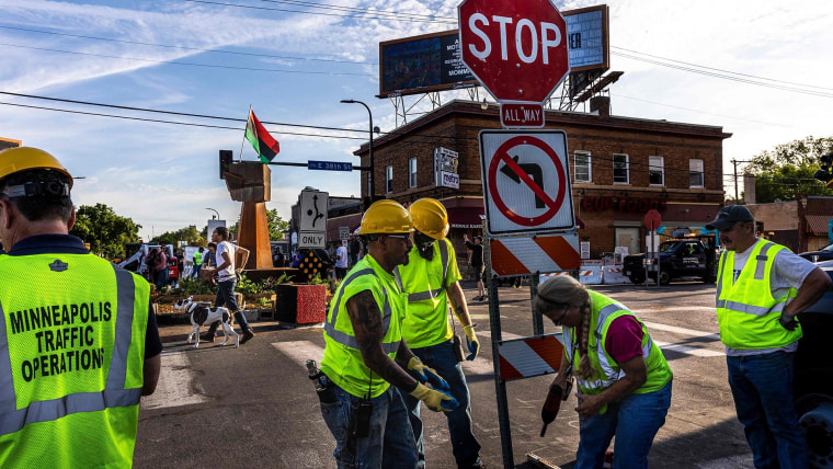 NBC News' Meagan Fitzgerald reports on the reasons behind construction crews removing barriers and memorial items from Minneapolis' George Floyd Square.June 3, 2021