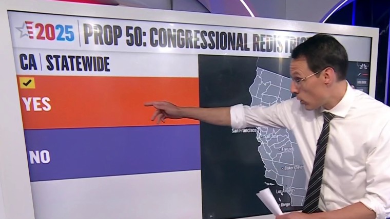 NBC News projects that the Congressional redistricting ballot measure in California known as Prop 50 has passed. NBC News' Steve Kornacki explains how the call was made and correspondent Liz Kreutz looks at sentiment in the state.Nov. 5, 2025