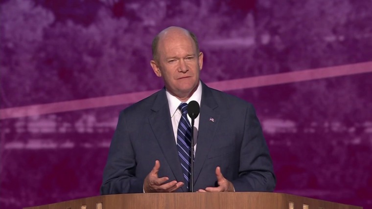At the Democratic National Convention, Senator Chris Coons of Delaware addressed the party by reflecting and praising President Joe Biden's administration and legacy, stating, "Biden helped us get back up again." Aug. 20, 2024