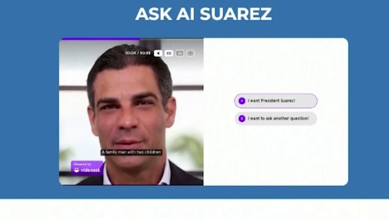 A super PAC supporting Republican presidential candidate Francis Suarez has released an A.I. bot to answer questions about his campaign. The answers are pre recorded and the chat bot picks what it believes is the best answer. NBC News' Valerie Castro reports. July 7, 2023