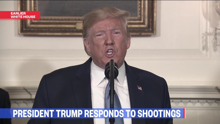 NBC News’ Hans Nichols reports on President Trump’s remarks in response to the mass shootings in Ohio and Texas. Trump said, “Now is the time to set destructive partisanship aside.”Aug. 5, 2019