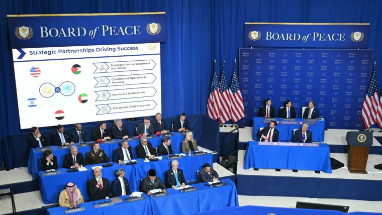 President Trump’s Board of Peace convened for its inaugural meeting in Washington, D.C., to focus on the next stage of the fragile ceasefire in Gaza. NBC News' Gabe Gutierrez reports on the attendance and what came out of the first gathering.Feb. 19, 2026
