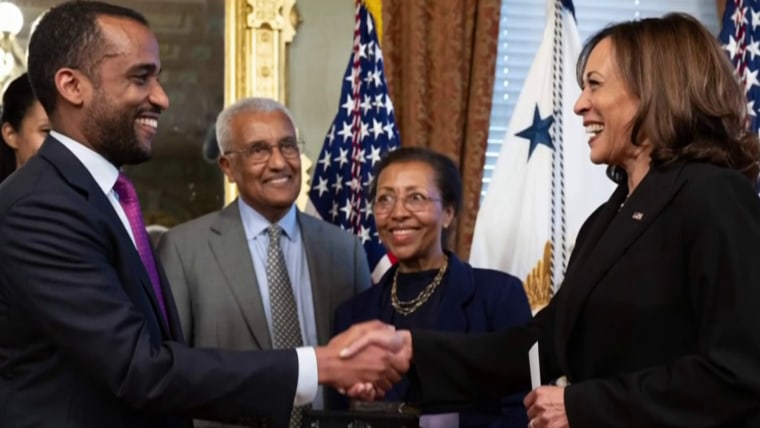Vice President Kamala Harris' campaign team has chosen U.S. Ambassador Yohannes Abraham to lead the presidential transition team. NBC News' Aaron Gilchrist has the details. Aug. 23, 2024