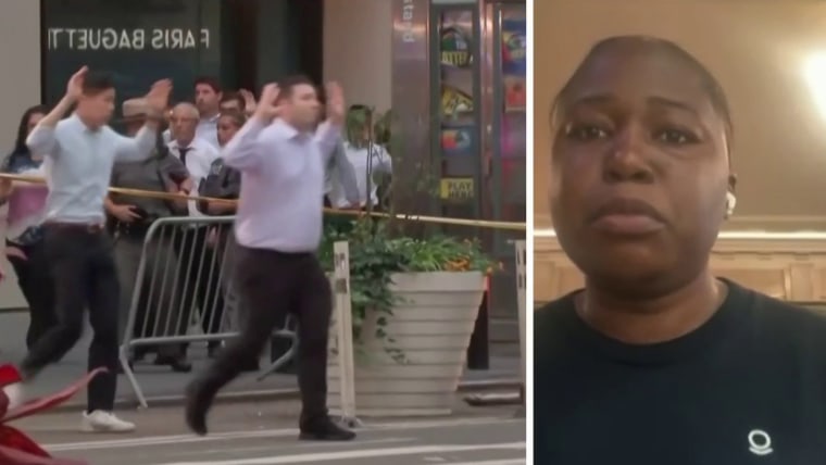Nekeisha Lewis spoke with NBC News' Savannah Sellers and Joe Fryer about what she witnessed the moment before and after a shooting at a Manhattan office building. Lewis was sitting outside with friends when the shooting broke out.July 29, 2025