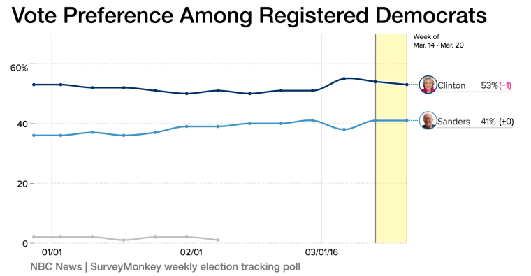 The NBC News|SurveyMonkey Weekly Election Tracking poll was conducted online March 14 through March 20, 2016 among a national sample of 13,389 adults aged 18 and over, including 11,600 who say they are registered to vote. Respondents for this non-probability survey were selected from the nearly three million people who take surveys on the SurveyMonkey platform each day. Results have an error estimate of plus or minus 1.4 percentage points. For full results and methodology for this weekly tracking poll, please click here.