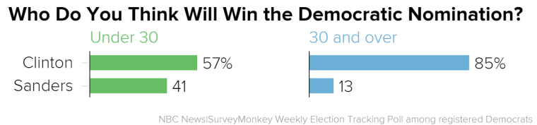 Though registered Democrats across all age groups say they think Clinton will win the nomination, Sanders’ key supporters — voters under age 30 — are much more optimistic that Sanders can win the nomination than voters older than 30.