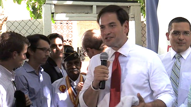 Republican presidential candidate Marco Rubio takes a jab at Democratic front-runner Hillary Clinton Friday in Puerto Rico.
