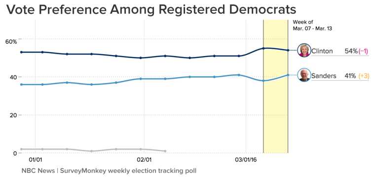 The NBC News|SurveyMonkey Weekly Election Tracking poll was conducted online March 7 through March 13, 2016 among a national sample of 8,840 adults aged 18 and over, including 7,321 who say they are registered to vote. Respondents for this non-probability survey were selected from the nearly three million people who take surveys on the SurveyMonkey platform each day. Results have an error estimate of plus or minus 1.7 percentage points.