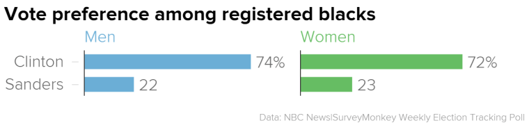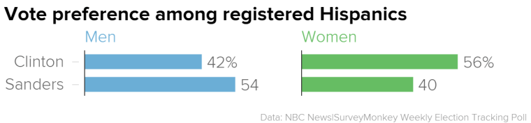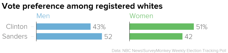 Results from our latest week of polling show that Sanders remains competitive with Clinton among registered Democratic and Democratic-leaning men overall — 46 percent for Sanders and 49 percent for Clinton. The margin among women, however, more decidedly favors Clinton. Women favor Clinton by nearly 20 points — 57 percent to 37 percent.