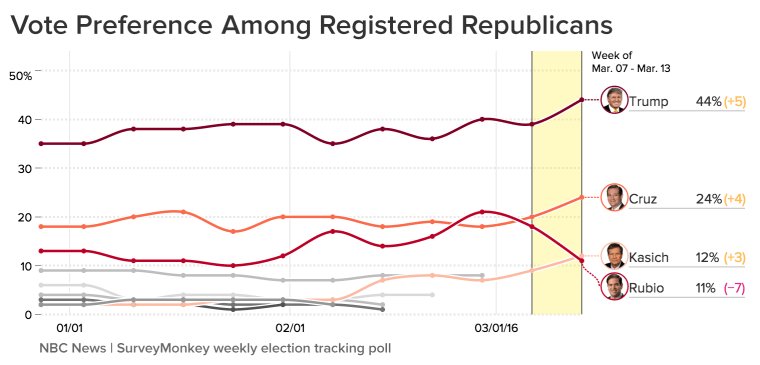 Trump leads Ted Cruz 44 to 24 percent, followed by John Kasich (12 percent) and Marco Rubio (11 percent). These results are according to the NBC News|SurveyMonkey Weekly Election Tracking Poll for the week of March 7 through March 13, 2016 among a national sample of 8,840 adults aged 18 and over, including 7,321 who say they are registered to vote.