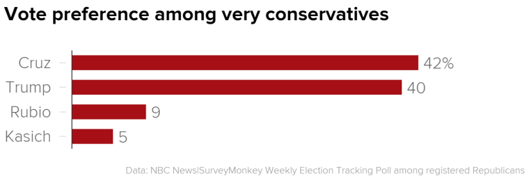 Republicans who describe themselves as very conservative, however, support Cruz over Trump, 42 percent to 40 percent. That margin is smaller than last week’s tracking poll, which showed Cruz winning 36 percent of those who identify as very conservative and Trump getting support from 31 percent of that group.