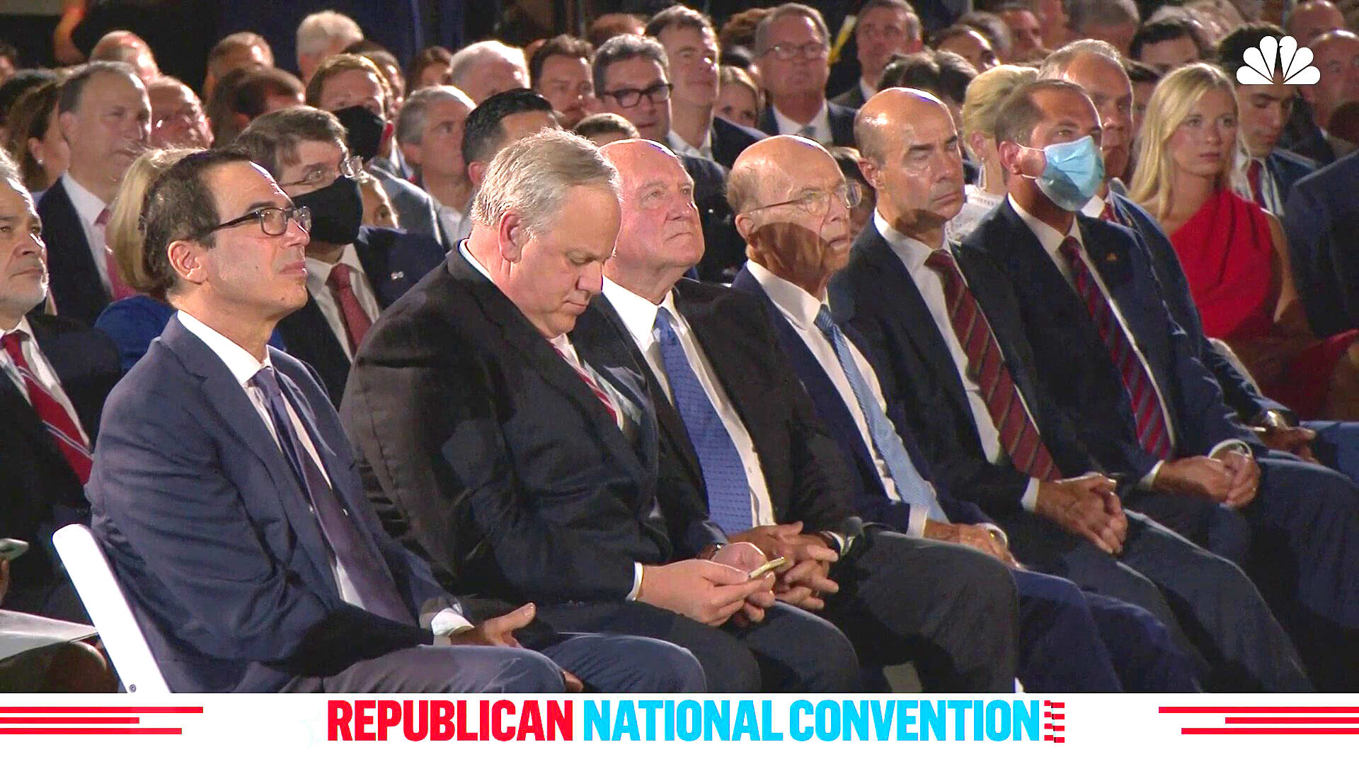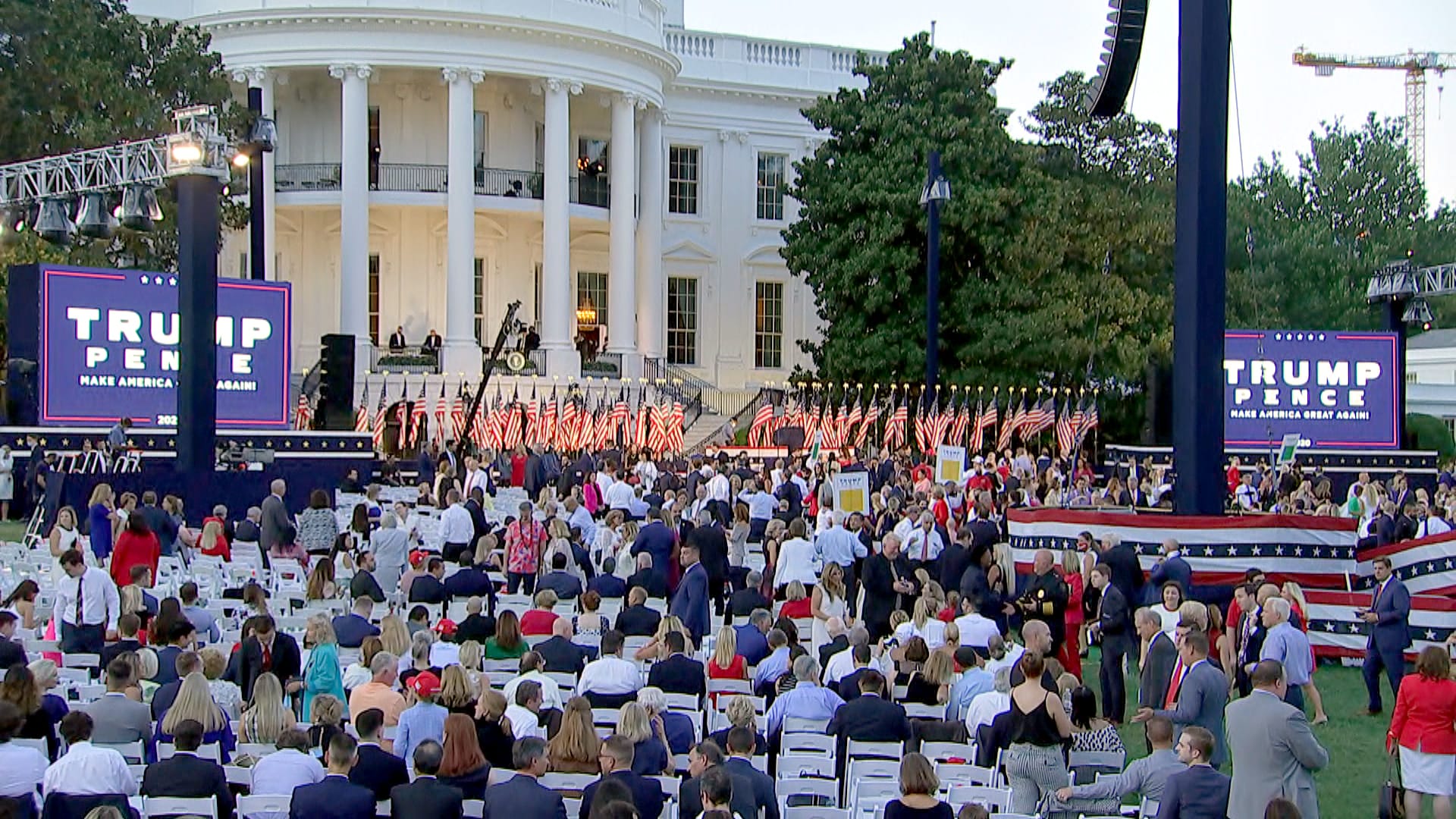 Chairs set up on the lawn ahead of the speech were well under 6 feet apart, flouting local social distancing guidelines. With a crowd of more than 1,000 people, tonight's speech appears to be the largest non-socially-distanced White House event in the COVID era. The crowd is made up of a mix of GOP lawmakers, delegates, friends, family and donors from all over the country — some of whom have flown in.