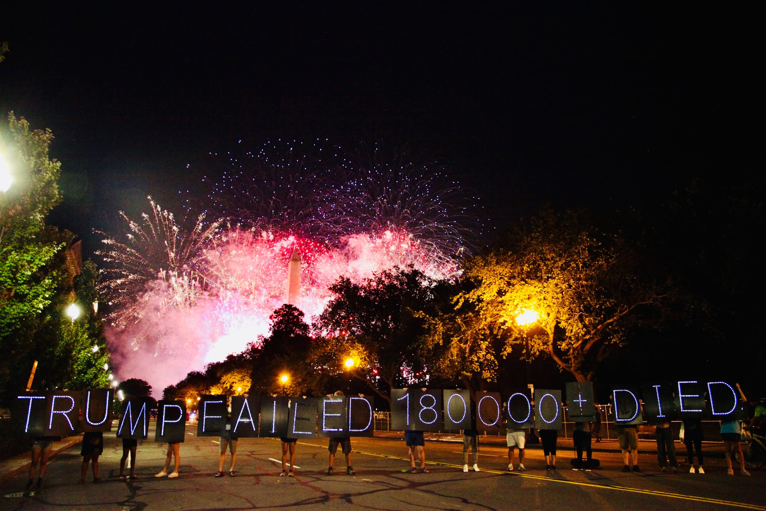 Protesters with the Democratic National Committee stand outside the White House during Trump campaign fireworks after President Donald Trump spoke from the South Lawn of the White House on the fourth day of the Republican National Convention on Aug. 27, 2020. Democratic National Committee