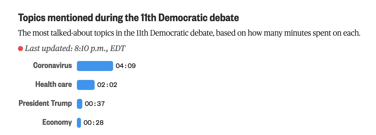 Ten minutes in and the coronavirus dominates the debate. See which topics get the most talk-time with our 11th debate topic tracker, updated live through the night.
